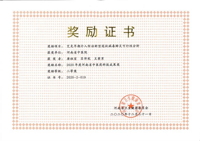 艾灸早期介入防治新型冠奖病毒肺炎可行性分析荣获2020年度河南省中医药科技成果奖